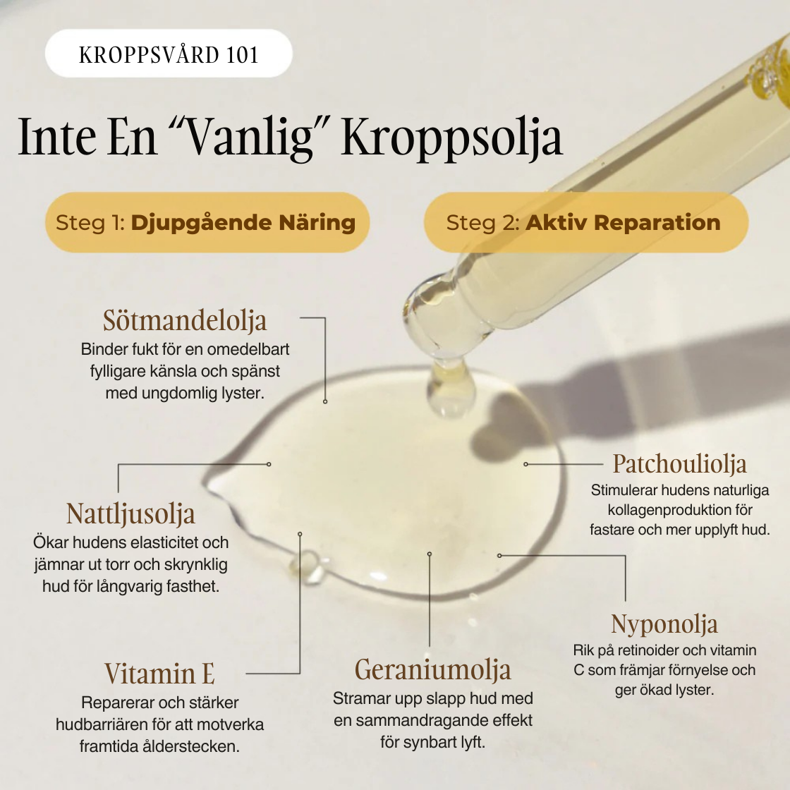 - Återfuktar, stärker och stramar upp slapp och “crepey” hud